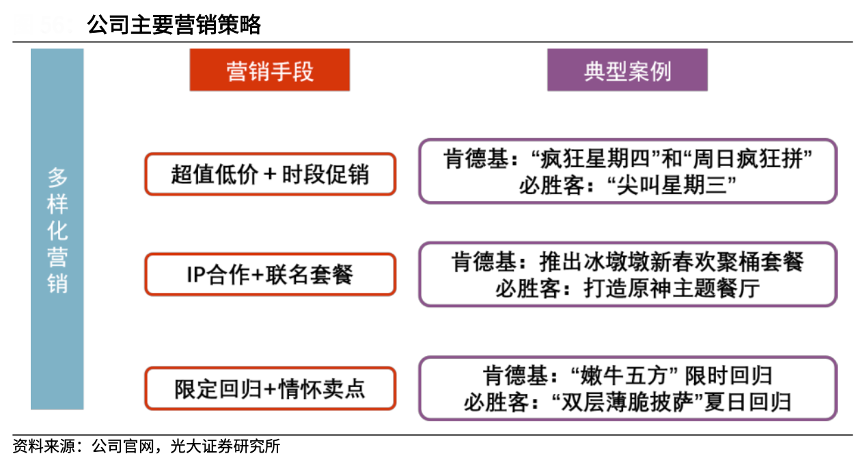 經(jīng)典案例:根據(jù)公司官網(wǎng)、光大證券研究所等綜合資訊表明,百勝中國公司以“超值促銷+IP 聯(lián)名”掌握流量密碼,“限時回歸”主打情懷營銷。其除了邀請明星廣告代言增加品牌曝光度外,公司也精心策劃出多個“出圈”的營銷活動,不斷強(qiáng)化品牌賣點(diǎn)。從火遍全網(wǎng)的“瘋狂星期四”段子,到必勝客原神主題餐廳,再到限時回歸經(jīng)典產(chǎn)品“嫩牛五方”,公司利用低價促銷、 IP 聯(lián)名和限定回歸等多樣手段進(jìn)行品牌營銷,打造品牌記憶點(diǎn)。