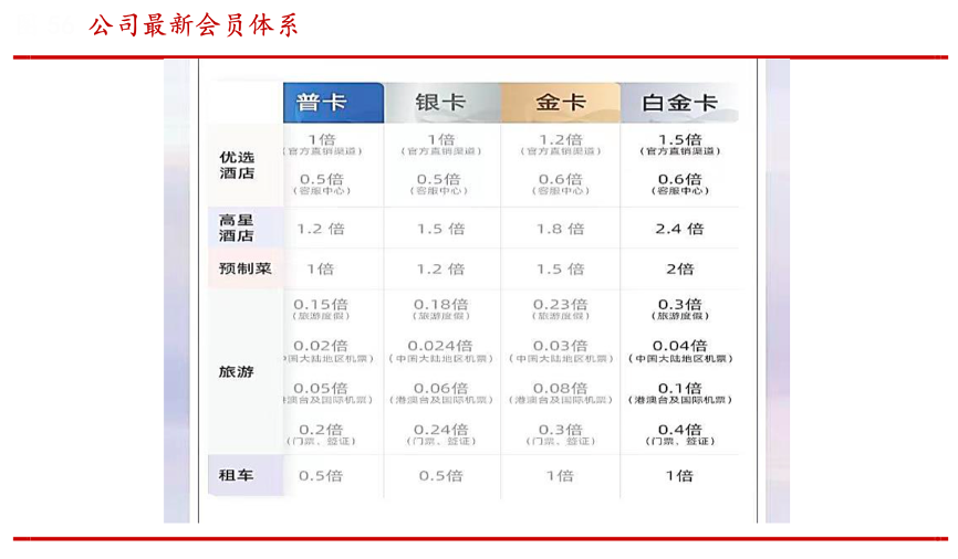 經典案例:根據華西證券研究所等綜合資訊表明,2023 年 5 月,錦江酒店公司正式推出錦江會員全新升級計劃,消費者若擁有中國區(qū)多個品牌的會員,則可以按照就高匹配原則僅保留一個錦江會員身份,分為普卡、銀卡、金卡、白金卡四擋,且將集團的餐飲、租車、旅游等板塊也納入積分兌換體系,大會員戰(zhàn)略再進一步。