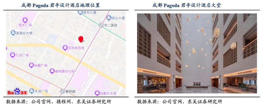 經(jīng)典案例:根據(jù)公司官網(wǎng)、攜程網(wǎng)、東吳證券研究所等綜合資訊表明,成都 Pagoda 于 2022 年 3 月 開業(yè),屬“Pagoda 君亭”品牌西南布局首店,其處于春熙路商圈,距離 成都時(shí)尚中心——太古里僅 5 分鐘步程。成都 Pagoda 大堂結(jié)合現(xiàn)代 AR 交互技術(shù),展示林俊廷先生作品《鎏瑩》,中庭采用獨(dú)特孔明燈設(shè)計(jì),營造中式設(shè)計(jì)氛圍。