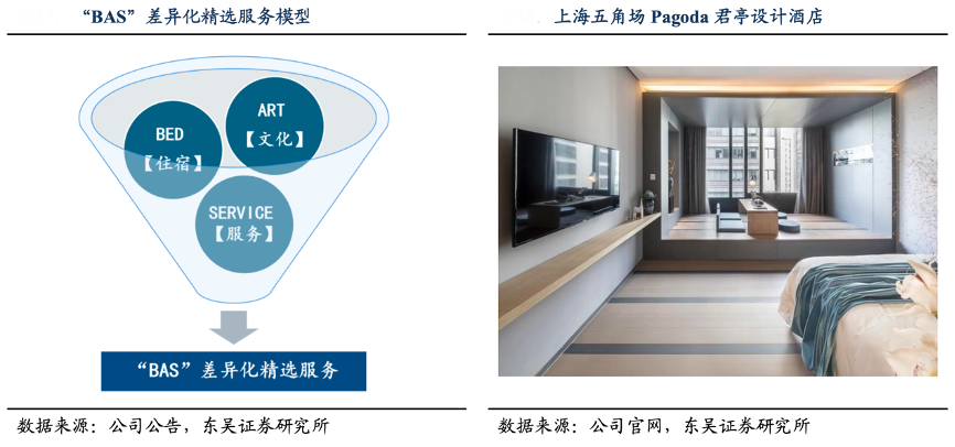經(jīng)典案例:根據(jù)公司公告、公司官網(wǎng)、東吳證券研究所等綜合資訊表明,君亭首創(chuàng)“BAS”模式,提供差異化精選服務(wù)。“BAS”模型即“Bed 住宿+Art 文化 藝術(shù)+ Service 服務(wù)”三位一體,以產(chǎn)品為基礎(chǔ),不斷提升品牌及體驗(yàn)。君亭立足于“BAS” 模式,形成“產(chǎn)品精選、文化精選及服務(wù)內(nèi)容精選”的君亭特色服務(wù)體系。
