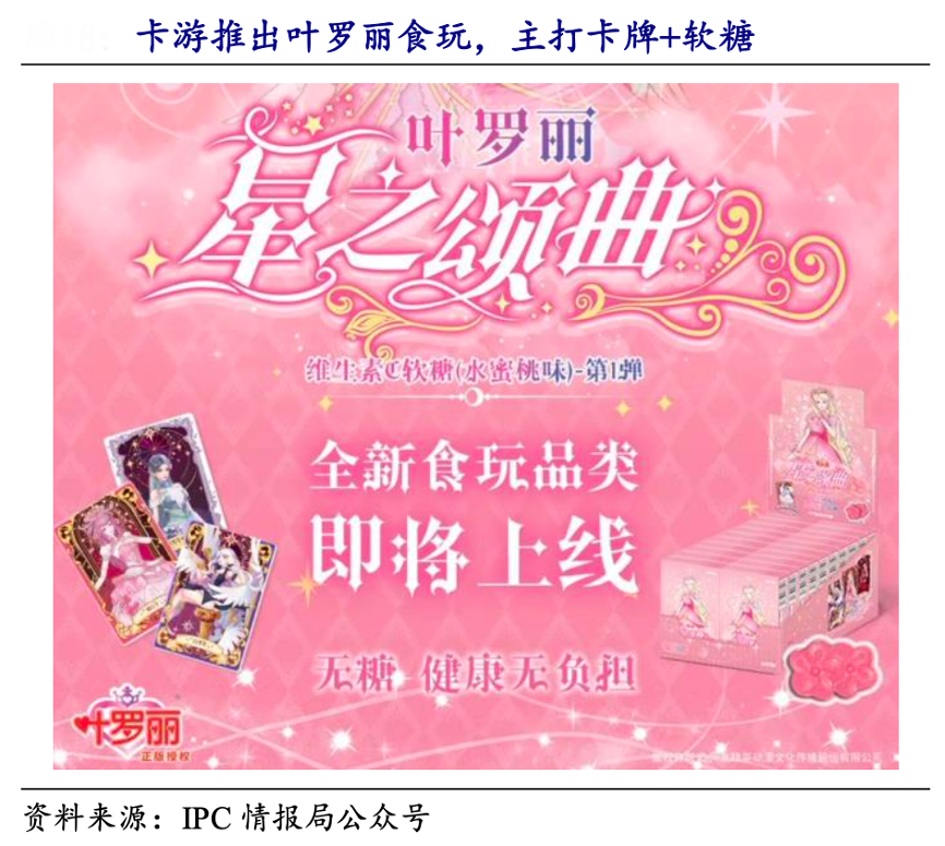 經(jīng)典案例:根據(jù)IPC情報局公眾號、開源證券研究所等綜合資訊表明,卡游在2024 年 7 月卡游向經(jīng)銷商發(fā)布了一則關于“將推出食玩類產品” 的公告,以提醒尚未有食品銷售資質的經(jīng)銷商增加相關類目,從而更好地推進商品銷售。首款食玩類產品“葉羅麗·星之頌曲·維生素 C 軟糖 (水蜜桃味)-第一彈”已上線。
