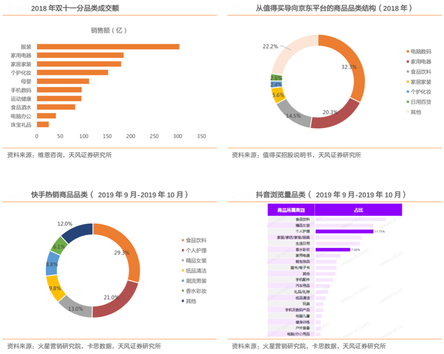 新零售電商企業(yè)所處平臺(tái)不同,其“品類矩陣構(gòu)建”有自己的特色,因互聯(lián)網(wǎng)平臺(tái)不同而具有不同品類結(jié)構(gòu)。據(jù)維恩咨詢、值得買招股說(shuō)明書(shū)、火星營(yíng)銷研究院、天風(fēng)證券研究所等綜合資訊表明,以阿里、京東等為代表的傳統(tǒng)電商類平臺(tái),其核心交易品類集中在服裝、3C家電、家居家裝等品類,而以快手、抖音等為代表的流量分發(fā)內(nèi)容平臺(tái),其核心品類則集中在食品飲料、美妝、日用品等相對(duì)價(jià)格更低的商品,流量匯聚更容易,商業(yè)變現(xiàn)更方便。