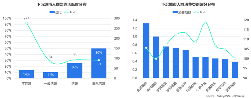 下沉城市消費(fèi)人群相對(duì)固定,年輕化群體較多,其具有一定的消費(fèi)習(xí)慣,根據(jù)TalkingData等綜合資訊表明,其區(qū)域內(nèi)以食品飲品、手機(jī)數(shù)據(jù)、家具家裝為代表的基礎(chǔ)性消費(fèi)占據(jù)其消費(fèi)主體,以家用電器、服飾首飾、電腦辦公等為代表的品質(zhì)性消費(fèi)在快速增長(zhǎng)中,以樂(lè)器、營(yíng)養(yǎng)保健等為代表的享受性消費(fèi)正在快速發(fā)展中,網(wǎng)購(gòu)占比正快速增長(zhǎng)中。