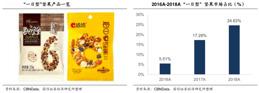 個性化、小包裝、多主題設(shè)計成為食品消費的主流態(tài)勢,目前小份裝零食成趨勢,銷售量逐年上升,其中小袋裝的果干、堅果等尤其受到歡迎。根據(jù)CBNData、國信證券經(jīng)濟(jì)研究所等綜合資訊表明,“一日型”等堅果營養(yǎng)搭配均衡,攜帶方便且隨時即食,深受消費者喜愛,近年來銷量逐年上升,2018 年“一日型”堅果已經(jīng)占據(jù)了近四分之一的堅果市場。