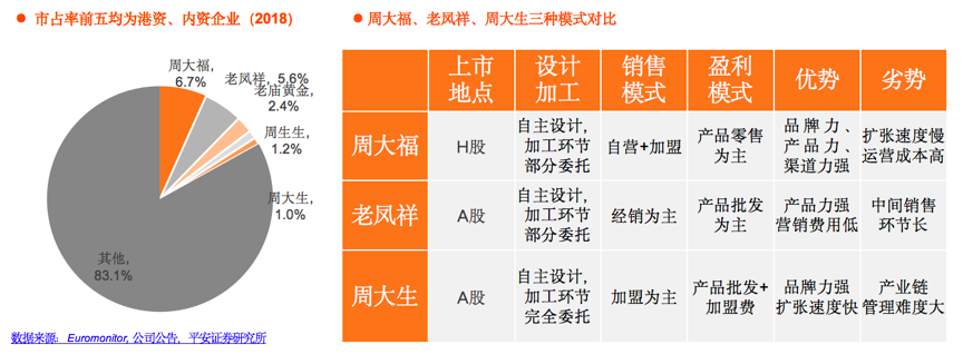 因歷史原因、行業(yè)發(fā)展特征等綜合要素來看,國內(nèi)黃金珠寶龍頭企業(yè)多為港資、內(nèi)資,如周大福、老鳳祥、周大生等,各企業(yè)經(jīng)營模式有所不同。根據(jù)各公司公告、Euromonitor、平安證券研究所等綜合資訊表明,“設計加工”是珠寶企業(yè)競爭核心要素之一,企業(yè)大多自主把控。加工環(huán)節(jié)利潤率偏低,部分或全部委托的模式較為常見。其產(chǎn)品銷售大致可分自營、加盟(加盟商僅運營單一品牌產(chǎn)品)、經(jīng)銷(可同時運營多品牌)三種途徑,龍頭企業(yè)利用加盟、經(jīng)銷模式積極下沉,下沉市場空間巨大,但自營門店投入成本高,難以快速搶占市場。因此近年來龍頭企業(yè)紛紛著力搭建加盟或經(jīng)銷網(wǎng)點,積極在低線城市中跑馬圈地、擠壓中小品牌的市場份額。