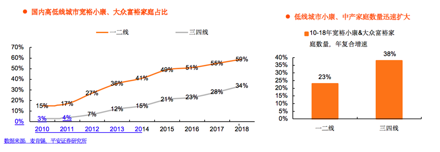 黃金珠寶行業(yè)在三四線等“下沉市場”有巨大的成長空間,低線城市富裕消費者快速增加,下沉市場消費升級空間巨大。根據(jù)麥肯錫、平安證券研究所等綜合資訊表明,我國三四線城市寬裕小康和大眾富裕家庭占比從2010年的3%快速上升至2018年的34%,家庭數(shù)量的 年復合增速高達38%,同期一二線CAGR僅為23%。此類小康、中產(chǎn)家庭的金銀珠寶等升級消費將進入越來越多低線城市消費者的“品類選擇范圍”。