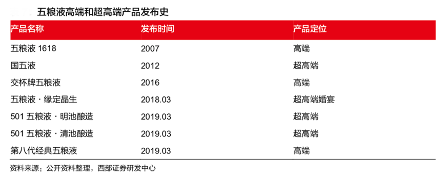 經(jīng)典案例:五糧液持續(xù)推進“超高端白酒產(chǎn)品”,鑄造品牌稀缺價值。據(jù)公開資料顯示,2019 年 3 月,公司發(fā)布全新超高端概念產(chǎn)品“501 五糧液”, 零售成交價定位 2000-3000 元/瓶,通過限定 501 車間、限定窖池、限定匠人這“三個限定”, 五糧液高端品牌價值極盡彰顯。