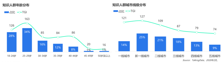 根據(jù)TalkingData等綜合資訊顯示,知識人群的年齡比較集中在25~34歲偏年輕類人群,基對于知識教育、技能提升等需求是比較迫切的,一線城市、新一線城市及二線城市等城市人群居多,激烈的市場競爭、升學(xué)升職壓力等迫使其更多關(guān)注知識更新和技能提升等。