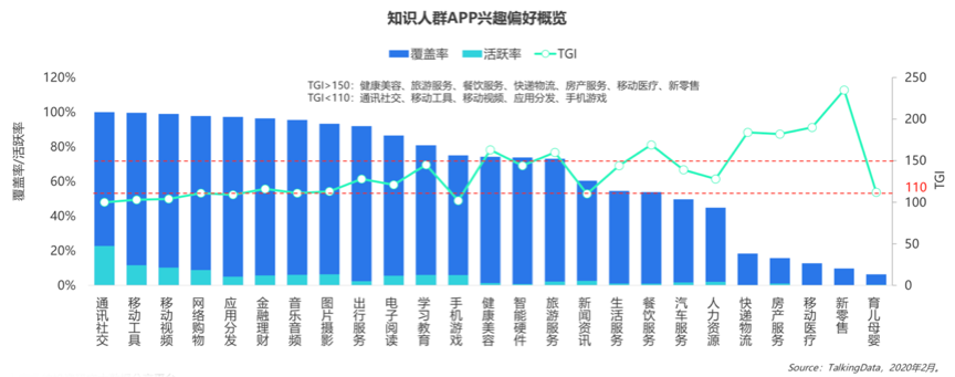 知識人群的興趣愛好比較集中在“知識內(nèi)容”和“個人技能提升”等方面,這正是知識人群品牌策劃營銷建設(shè)的“核心立基點”,強化其專業(yè)性是極有價值的。根據(jù)TalkingData等綜合資訊顯示,知識人群多數(shù)深度依賴“移動互聯(lián)網(wǎng)”,通訊社交、移動工具、移動視頻、網(wǎng)絡(luò)購物等基礎(chǔ)應(yīng)用受歡迎度高,同時對金融理財、音樂音頻、電子閱讀、學(xué)習(xí)教育等有天生的熱愛感和追隨度,也是知識人群新零售電商營銷策劃提升的絕佳發(fā)力點。