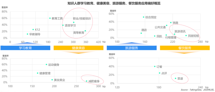 受知識人群歡迎的內(nèi)容有自己的特色及領(lǐng)域歸屬,構(gòu)建專業(yè)化、高價值的“品牌內(nèi)容池”就要重點關(guān)注這些內(nèi)容。根據(jù)TalkingData等綜合資訊顯示,知識人群追求對高等教育、語言學(xué)習(xí)、職業(yè)/技能培訓(xùn)類應(yīng)用有天生的好感,同時注重“個人旅游、身材管理等,運動健身類應(yīng)用覆蓋率60%以上,這些內(nèi)容值得各企業(yè)重點關(guān)注、全面收集及重點分析。