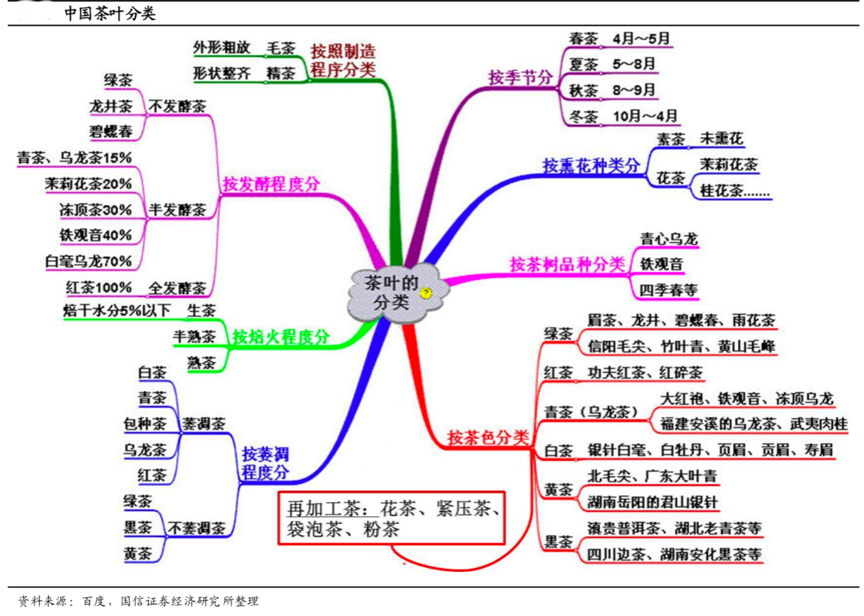 茶葉的多樣性及多分類依然存在,多類型多檔次茶葉引領著“多元化茶消費”。茶葉種類繁多,根據(jù)國家最新版《茶葉分類》、百度、國信證券經(jīng)濟研究所等綜合資訊表明,茶葉可以分為七大類,包括綠茶、紅茶等。同時,茶葉中含有茶多酚、茶多糖、茶氨基、維生 素和礦物質(zhì)等,具備提神醒腦、助消化、抗氧化、降血壓等功能;茶葉消費也多圍繞著其功能價值、口味價值等展開。