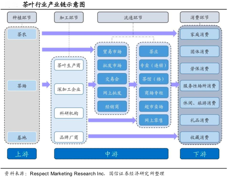 茶葉產(chǎn)品的“產(chǎn)業(yè)鏈經(jīng)營特征”明顯,“產(chǎn)品為王 價值點亮 服務增值”成為茶產(chǎn)業(yè)發(fā)展的關鍵詞。根據(jù)Respect Marketing Research Inc、國信證券經(jīng)濟研究所等綜合資訊表明,茶葉品牌經(jīng)營需要依托于“茶產(chǎn)業(yè)鏈”來推進,茶葉行業(yè)包括上游的種植環(huán)節(jié),中游的加工、流通環(huán)節(jié),以及下游的消費環(huán)節(jié),茶葉不僅可以直接供消費者飲用,還可以通過深加工制成速溶茶、 茶飲料、茶食品、茶保健品和茶日化品等。“產(chǎn)品為王”依托于茶產(chǎn)業(yè)鏈的高效運轉(zhuǎn),“價值點亮”需要茶企關注茶葉品牌的價值塑造、檔次升級及溢價支撐等,而“服務增值”則提醒茶企圍繞“茶葉交易及消費”構(gòu)建全方位的品牌化服務體系,關注品牌化交易場景及“個性化茶消費體驗”。