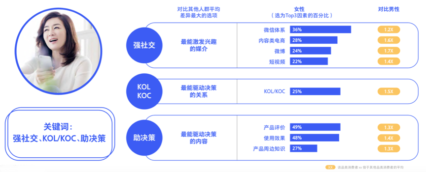 據(jù)騰訊、BCG《2020中國社交零售白皮書》調(diào)查數(shù)據(jù)表明,56%女性易被社交媒介激發(fā)興趣,高于男性的45%,尤其是微信體系、內(nèi)容類電商、微博和短視頻;同時(shí),她們喜愛閱讀他人評(píng)價(jià),利用他人判斷幫助自己決策,更容易被他人影響、被KOL/KOC種草。