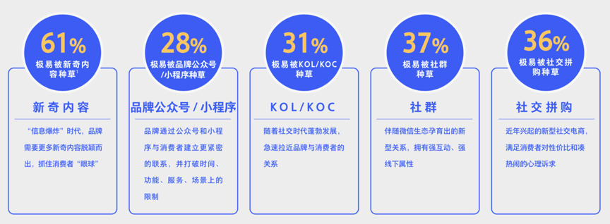 據(jù)騰訊、BCG《2020中國社交零售白皮書》調(diào)查數(shù)據(jù)表明,社交新零售有五大觸點(diǎn),其中61%的用戶會(huì)極容易被新奇內(nèi)容所吸引,28%的用戶會(huì)被品牌公眾號(hào)/小程序的文章種草,31%的用戶極容易被KOL/KOC所種草,37%的用戶會(huì)被社群所種草,而36%的用戶會(huì)被社交拼購活動(dòng)所影響。