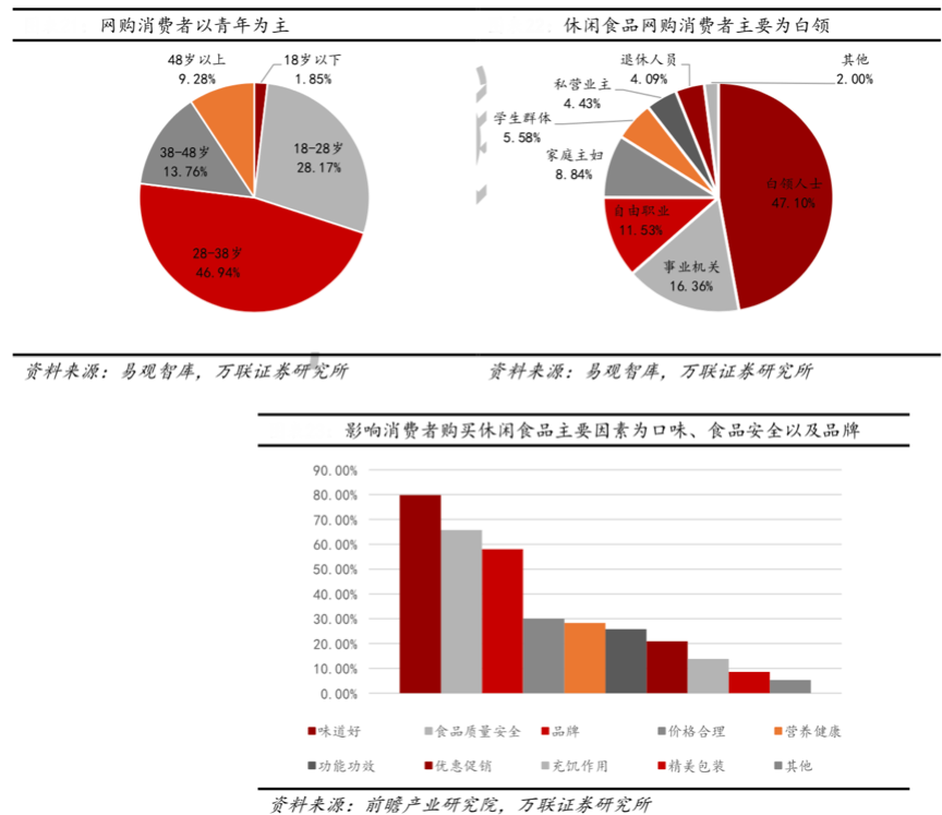 休閑食品日益受到年輕消費群體的歡迎,消費的年輕化、時尚化和休閑化等特征明顯。據易觀智庫統(tǒng)計,從消費者年齡結構看,我國休閑食品網購消費者 75%為 18-38 歲的年輕消費者,從消費者職業(yè)特征看,白領為主要網購消費者,占比分別為 47.1%。這部分人群更加重視產品品質及服務,對品牌的認可度和忠誠度也更高。同時根據前瞻研究院調查結果顯示,影響休閑食品網購消費 者決策的三大主要因素為口味、食品質量安全和品牌,分別占到統(tǒng)計樣本的79.8%、 65.7%和 58.0%。隨著民眾生活水平的提升,休閑食品消費的品質化、健康化、個性化趨勢日益明顯。