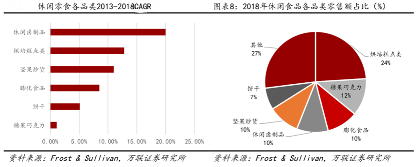 休閑品類多樣,各類休閑食品都有其粉絲,分圈層經營、分品類運作等異常明顯。根據Forst&Sullivan、萬聯(lián)證券研究所等綜合資訊表明,從各細分品類零售額占比來看,2018年主要品類中烘培糕點類產品占比最高,達24%;餅干類產品占比最低,僅占7%;糖果類、膨化類、休閑鹵制品及堅果炒貨占比均在10%左右;烘焙糕點類產品占據主流地位,糖果、堅果類產品快速發(fā)展。