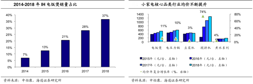 “分品類(lèi)產(chǎn)品價(jià)格升級(jí)”提升“品牌感知質(zhì)量”,擴(kuò)大了品牌的質(zhì)量影響力。各廚房小家電產(chǎn)品日益受益于消費(fèi)升級(jí),廚房電器各品類(lèi)產(chǎn)品均價(jià)穩(wěn)步提升。根據(jù)中怡康、海通證券研究所等綜合資訊表明,電飯煲品類(lèi)由于IH電飯煲產(chǎn)品占比提升,其均價(jià)有了較大幅度的提升; 由于破壁技術(shù),攪拌機(jī)品類(lèi)的均價(jià)提升幅度最大。
