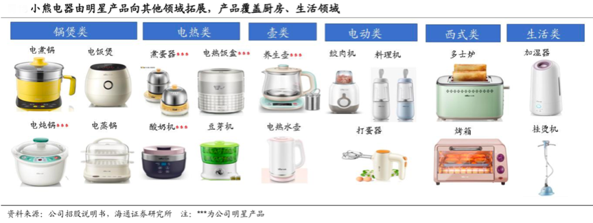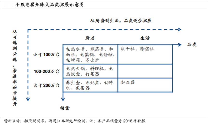 廚房小家電的“品牌資產(chǎn)感知”多數(shù)來(lái)自于“產(chǎn)品消費(fèi)”、“服務(wù)感知”及多類(lèi)細(xì)分人群開(kāi)發(fā),以多品類(lèi)構(gòu)建“生活家電”復(fù)合式品牌聯(lián)想。根據(jù)小熊電器招股說(shuō)明書(shū)、海通證券研究所等綜合資訊表明,小熊電器矩陣式品類(lèi)拓展已經(jīng)形成,從廚房小家電向“生活家電品類(lèi)”延展很見(jiàn)成效,其不斷挖掘消費(fèi)者需求,培育可選品類(lèi),伴隨可選品類(lèi)逐步發(fā)展到必選品類(lèi)的過(guò)程中不斷擴(kuò)大自身收入規(guī)模。