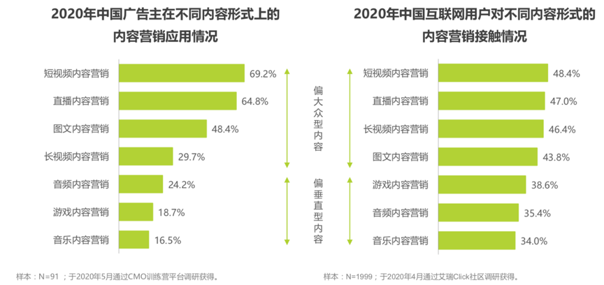 高效組合休閑食品品牌類內容媒介,提升內容營銷的傳播速度,這是休閑食品企業(yè)致勝市場的關鍵所在。根據(jù)艾瑞網(wǎng)《2020年中國內容營銷策略研究報告》等綜合資訊顯示,廣告主對不同內容形式的內容營銷應用程度,和用戶對不同內容形式的內容營銷接觸程度,基本保持一致,“短視頻內容營銷”、直播內容營銷和圖文內容營銷等是中國廣告主和互聯(lián)網(wǎng)用戶都很重視的形式,而游戲、音頻和音樂受眾 相對垂直,廣告主在內容營銷上應用相對較少,用戶接觸感知程度也較低。