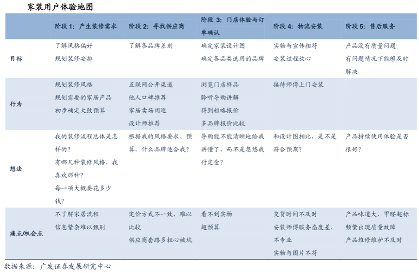 以家裝行業(yè)品牌策劃為例,根據(jù)廣發(fā)證券發(fā)展研究中心等綜合資訊顯示,“家裝用戶體驗(yàn)地圖”涉及到需求產(chǎn)生、供應(yīng)商尋找、門(mén)店體驗(yàn)與訂單確認(rèn)等多個(gè)環(huán)節(jié);前瞻家裝家居行業(yè)發(fā)展,消費(fèi)者的家裝消費(fèi)痛點(diǎn)集中在三個(gè)方面:1)不清楚裝修的核心需求及實(shí)現(xiàn)方式,單純靠用戶只能表達(dá)裝修的結(jié)果及想展現(xiàn)的家居生活,具體怎樣選擇風(fēng)格、規(guī)劃裝修及配備怎樣的建材產(chǎn)品、家具等家居消費(fèi)者并不很清楚;2)對(duì)終端門(mén)店體驗(yàn)一般,需要走多家門(mén)店、權(quán)衡多家品牌才能真正實(shí)現(xiàn)自己的裝修方案;3)希望服務(wù)商、品牌商對(duì)家裝過(guò)程進(jìn)行適度跟進(jìn)及有效反饋,不是一賣(mài)了之。