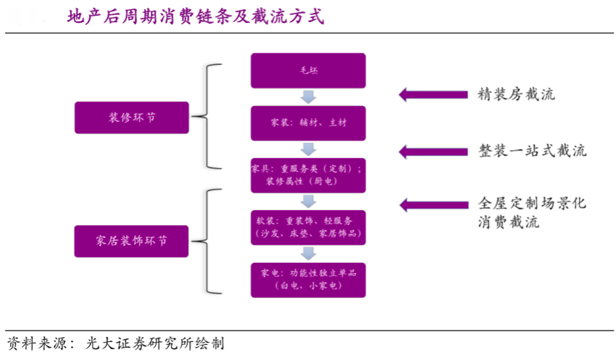 與其它消費(fèi)品行業(yè)相比,家居消費(fèi)深受地產(chǎn)行業(yè)影響,根據(jù)光大證券研究所繪制的相關(guān)資料顯示,在地產(chǎn)后周期時(shí)代,家居消費(fèi)被精裝房半個(gè)、整裝一站式、全屋定制場(chǎng)景化消費(fèi)等多次消費(fèi)截流,消費(fèi)者被大量的細(xì)分截流,此種“多重消費(fèi)截流”的情形下,家居新零售品牌營(yíng)銷策劃需要更加關(guān)注終端的消費(fèi)體驗(yàn),放大品牌背書(shū),亮化品牌的品質(zhì)化表達(dá)。