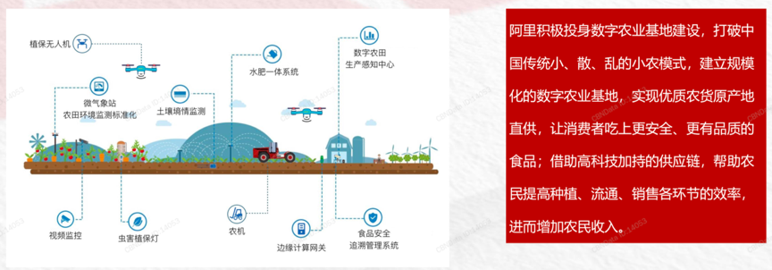 “農(nóng)業(yè)數(shù)字化”驅(qū)動著農(nóng)業(yè)產(chǎn)業(yè)化的步伐,指引著企業(yè)發(fā)展的方向,刷新著農(nóng)業(yè)產(chǎn)業(yè)化的高效產(chǎn)出。根據(jù)中央一號文件指出,要加強(qiáng)現(xiàn)代農(nóng)業(yè)設(shè)施建設(shè),加快物聯(lián)網(wǎng)、大數(shù)據(jù)、區(qū)塊鏈、人工智能、第五代移動通信網(wǎng)絡(luò)、智慧氣象等現(xiàn)代信 息技術(shù)在農(nóng)業(yè)領(lǐng)域的應(yīng)用。同時,根據(jù)阿里研究院《2020阿里農(nóng)產(chǎn)品電商報告》等綜合資訊表明,5G時代來臨、鄉(xiāng)村振興疊加數(shù)字農(nóng)業(yè)相關(guān)政策,將共同助力數(shù)字農(nóng)業(yè)步入快速發(fā)展期,阿里的“數(shù)字農(nóng)業(yè)基地建設(shè)”倍受關(guān)注,農(nóng)產(chǎn)品消費(fèi)牽引、數(shù)字農(nóng)業(yè)生產(chǎn)加持、農(nóng)業(yè)數(shù)據(jù)大賦能,數(shù)字化農(nóng)業(yè)讓農(nóng)業(yè)產(chǎn)業(yè)化發(fā)展更上一層樓。