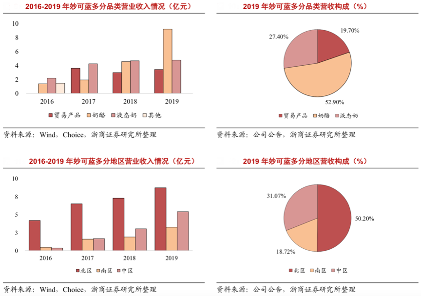 經(jīng)典案例:根據(jù)公司公告、浙商證券研究所、wind、choice等綜合資訊表明,妙可藍(lán)多的奶酪產(chǎn)品貢獻(xiàn)主要營收,北部區(qū)域營收占比最大。2019 年,公司奶酪實(shí)現(xiàn)營收 9.21 億元,其公司北區(qū)實(shí)現(xiàn)營收 8.74 億元,同比+19.96%,營收占比 50.20%。