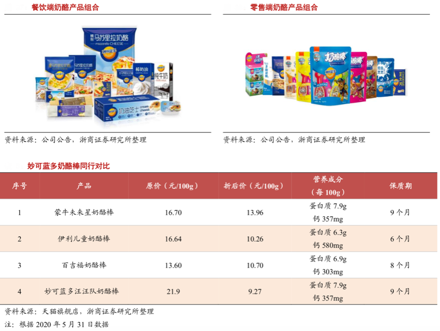經(jīng)典案例:根據(jù)公司公告、浙商證券研究所、天貓旗艦店等綜合資訊表明,妙可藍(lán)多2019 年奶酪板塊實(shí)現(xiàn)營收9.21 億(營收占比 53%),同比+102.20%。 零售端以奶酪棒為核心產(chǎn)品,即食奶酪系列采用卡通風(fēng)格包裝、內(nèi)藏益智問答游戲、開發(fā)多種口味(原味、混合水果味、巧克力味等)吸引兒童消費(fèi)群體,其中明星產(chǎn)品奶酪棒 2019 年實(shí)現(xiàn)銷售收入 4.96 億元(占奶酪板塊營收 53.79%);餐飲端以馬蘇里拉奶酪為核心產(chǎn)品,加強(qiáng)芝士片、黃油、稀奶油產(chǎn)品開發(fā),滿足客戶個(gè)性化和多樣化需求。