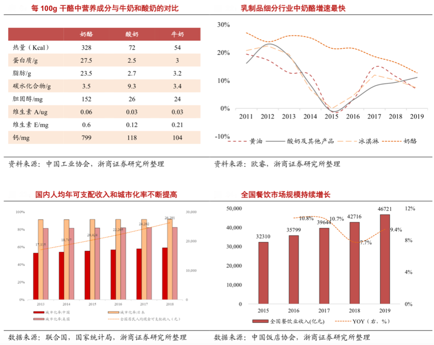 “乳品奶酪”的產(chǎn)品教育正在快速推進(jìn),“利基型消費(fèi)者”正在形成,消費(fèi)市場(chǎng)正在形成。根據(jù)中國工業(yè)協(xié)會(huì)、浙商證券研究所、國家統(tǒng)計(jì)局、歐睿等綜合資訊表明,隨著中國城鎮(zhèn)化率不斷提升,消費(fèi)者追求更加高品質(zhì)的蛋白質(zhì)食品,奶酪高倍濃縮了牛奶中的營養(yǎng)成分,其蛋白質(zhì)含量(每 100g 約含 25 克)是鮮奶(每 100g 約含 3 克)的8倍以上,被公認(rèn)為“乳品之王,奶中黃金”。并且餐飲行業(yè)需求旺盛,也進(jìn)一步地推動(dòng)奶酪行業(yè)快速發(fā)展。