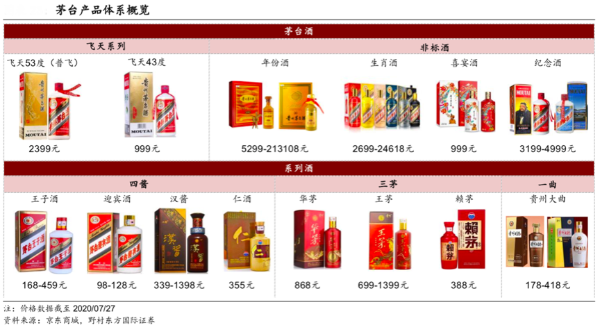 經(jīng)典案例:根據(jù)京東商城、野村東方國際證券等綜合資訊表明,茅臺旗下主要有茅臺酒(53 度普通飛天茅臺、低度茅臺酒,以及附加價值更 高的非標酒包含生肖酒、定制酒、紀念酒等)與系列酒(一曲三茅四醬,“一曲” 即貴州大曲,“三茅”即賴茅、王茅以及華茅,“四醬”則為茅臺王子酒、茅臺迎賓酒、漢醬酒以及仁酒)。