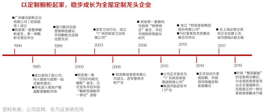 經(jīng)典案例:根據(jù)公司官網(wǎng)、東方證券研究所等綜合資訊表明,歐派家居成立于1994年,由定制櫥柜起步,在之后的 25 年里逐步向全屋產(chǎn)品延伸,分別于2003年、2006年、2010年進軍衛(wèi)浴、衣柜及木門產(chǎn)業(yè),并于2014年正式啟動大家居戰(zhàn)略,穩(wěn)步成長為國內(nèi)規(guī)模領(lǐng)先的全屋定制龍頭企業(yè)。