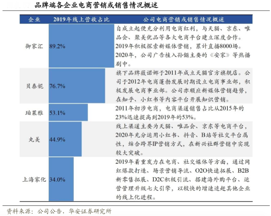 經(jīng)典案例:根據(jù)公司公告、華安證券研究所等綜合資訊表明,以化妝品行業(yè)為例,御家匯和貝泰妮早期線上化程度高,電商紅利助其增長。而起家線下的珀萊雅、丸美能夠迅速在 2011- 2012 年電商快速發(fā)展時把握電商紅利。上海家化雖在傳統(tǒng)電商紅利階段反應略遲鈍, 但在當前的社交電商階段能夠迅速適應市場發(fā)展。“商業(yè)模式創(chuàng)新”持續(xù)引領著行業(yè)發(fā)展。