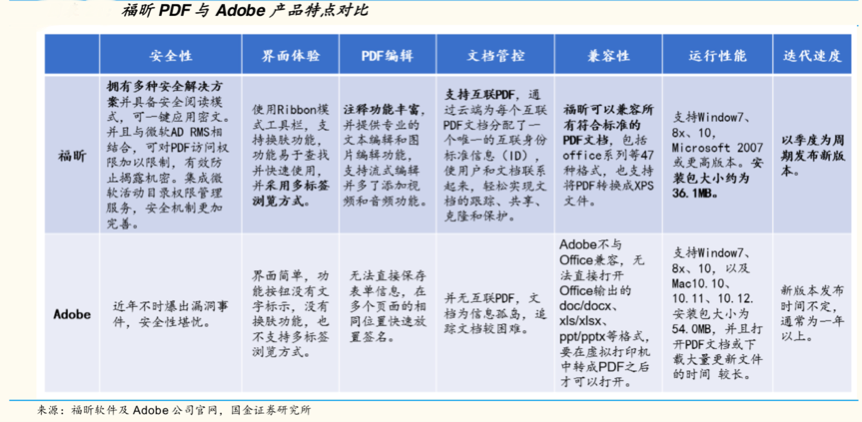經(jīng)典案例:根據(jù)福昕軟件及Adobe公司官網(wǎng)、國金證券研究所等綜合資訊表明,從產(chǎn)品性 能上看,福昕 PDF 在安全性、 界面體驗、 PDF 編輯功能、文 檔 管控、兼容性、運(yùn)行性能及迭代速度上都較 Adobe 更有優(yōu)勢。