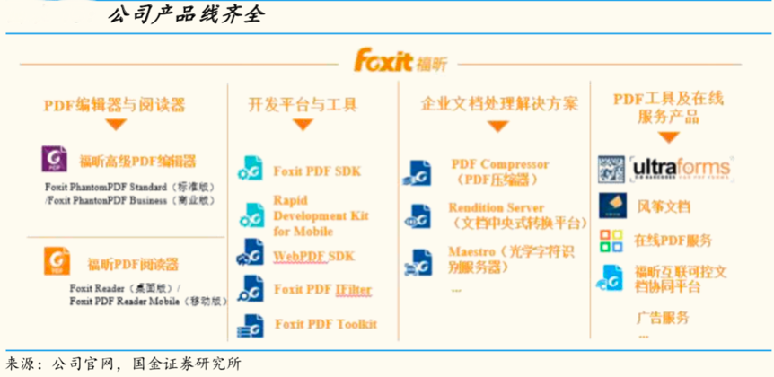 經(jīng)典案例:根據(jù)公司官網(wǎng)、國金證券研究所等綜合資訊表明,公司在 PDF 電子文檔領(lǐng)域內(nèi)經(jīng)過近 20 年的產(chǎn)品開發(fā)及升級更新,已經(jīng)建立起一整套擁有完全自主知識產(chǎn)權(quán)的 PDF 技術(shù)體系,形成了包括通用軟件產(chǎn)品、開發(fā)平臺與工具、企業(yè)文檔自 動化解決方案等覆蓋整個 PDF 文檔生命周期的軟件產(chǎn)品與解決方案,能夠滿足各類用戶差異化的需求。