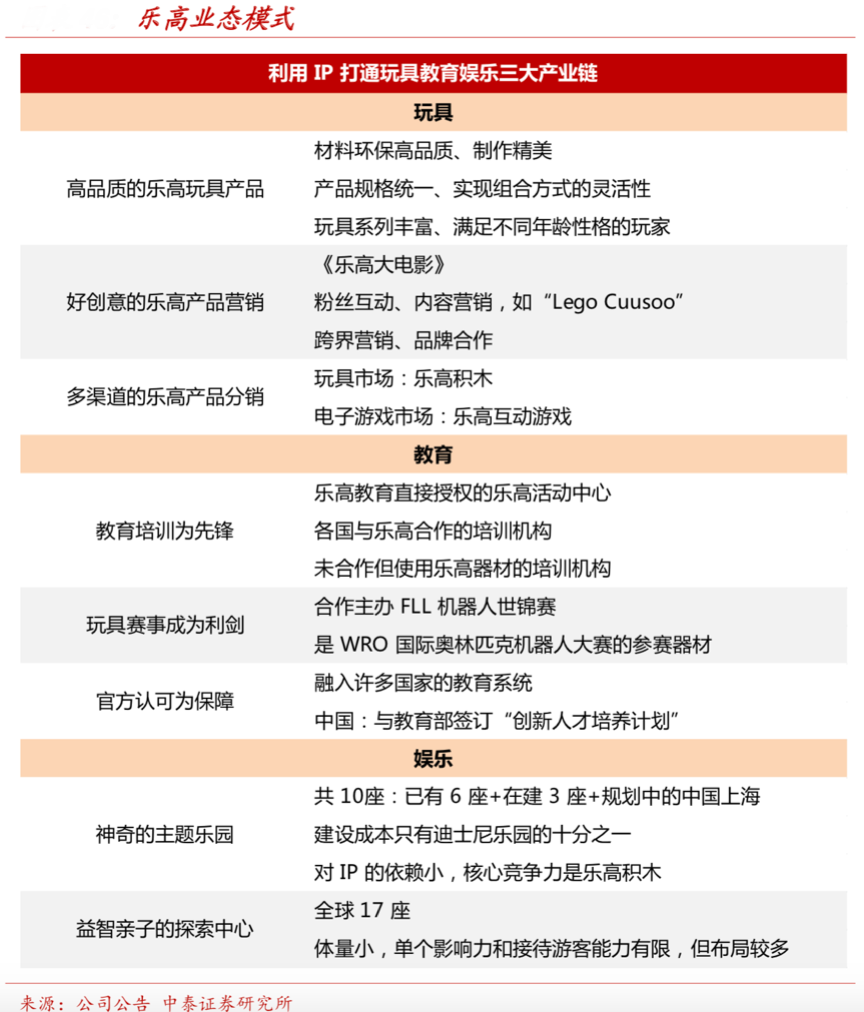 經(jīng)典案例:根據(jù)公司公告、中泰證券研究所等綜合資訊表明,樂(lè)高通過(guò)“強(qiáng)大品牌IP”打通玩具教育娛樂(lè)三大產(chǎn)業(yè)鏈。其既擁有高品質(zhì)的玩具產(chǎn)品和一系列的媒體營(yíng)銷,又一方面通過(guò)活動(dòng)和培訓(xùn)中心來(lái)拓展教育業(yè)務(wù),另一方面與官方合作,融入許多國(guó)家的教育體系和國(guó)際比賽;并以“樂(lè)高主題樂(lè)園”和“親子探索中心”點(diǎn)亮用戶體驗(yàn)感,“快樂(lè)”的品牌形象深入人心。