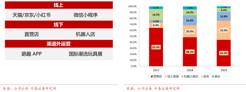 經(jīng)典案例:根據(jù)公司公告、中泰證券研究所等綜合資訊表明,截至到 2019 年末,泡泡瑪特的零售店、線上和機(jī)器人商店的渠道銷售占比分別為 43.9%/32%/14.8%,同比收入增速分別為 198%/424%/188%,均保持了高速增長(zhǎng),其中線上收入的增速最快,其全渠道銷售、全場(chǎng)景互動(dòng)的“消費(fèi)者心智格局”基本形成。