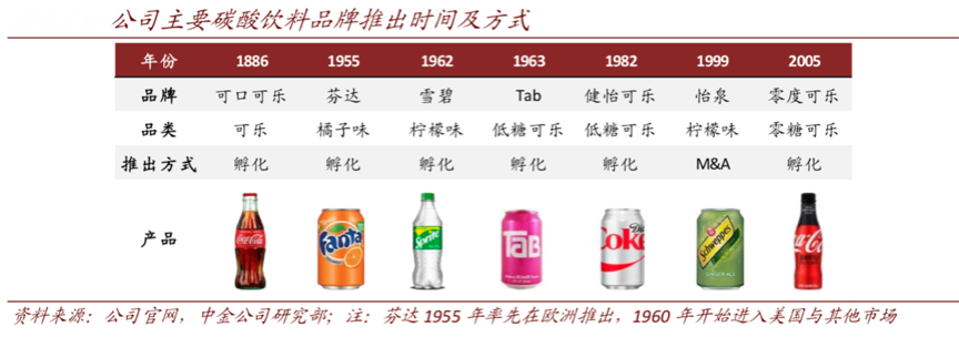 經(jīng)典案例:根據(jù)公司官網(wǎng)、中金公司研究部等綜合資訊表明,可口可樂為應(yīng)對競爭,其自1955 年陸續(xù)推出橘子味汽水芬達、檸檬味雪碧及低糖可樂 Tab,豐富碳 酸飲料產(chǎn)品線。自 1982 年隨消費者健康意識提升,公司首次延伸可樂產(chǎn)品線,推出健怡 可樂,帶動碳酸市占率企穩(wěn)回升。與時俱進,產(chǎn)業(yè)品牌策劃營銷自然碩果累累。