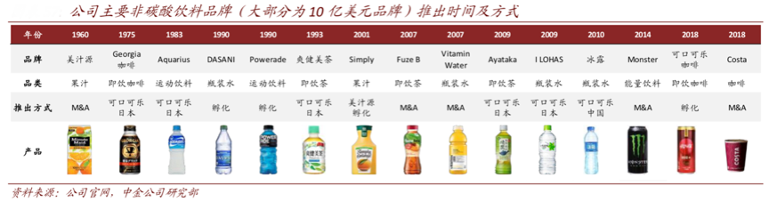 經(jīng)典案例:根據(jù)公司官網(wǎng)、中金公司研究部等綜合資訊表明,隨著 2000 年左右碳酸飲料市場增速放緩,可口可樂公司品類多元化節(jié)奏明顯加快,發(fā)力高成長品類,相繼在果汁、即飲茶、瓶裝水等領(lǐng)域成功推出多個 10 億美元量級品牌,如 Simply、Fuze B、Vitamin Water、 Ayataka 及冰露等,以“獨立品牌覆”細(xì)分蓋多個消費品類。