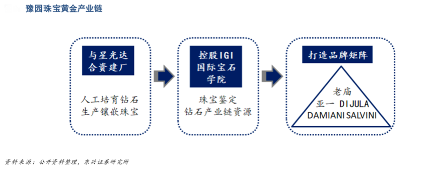 經(jīng)典案例:根據(jù)公開資訊、東興證券研究所等綜合資訊表明,豫園收購(gòu) IGI 國(guó)際寶石學(xué)院幫助公司實(shí)現(xiàn)戰(zhàn)略布局“全球鉆石產(chǎn)業(yè)鏈”,使得公司能更好地獲得鉆石領(lǐng)域?qū)I(yè)知識(shí)及行業(yè)資源的同時(shí)將產(chǎn)業(yè)鏈進(jìn)一步向非黃金業(yè)延伸。與星光達(dá)的合作幫助公司打通上游,加強(qiáng)珠寶鑲嵌制造端優(yōu)勢(shì),以便更進(jìn)一步開拓市場(chǎng)。