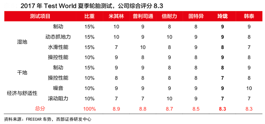 經(jīng)典案例:根據(jù)FREECAR車勢(shì)、西部證券研發(fā)中心等綜合資訊表明,在2017 年Test World 夏季輪胎測(cè)試中,玲瓏輪胎綜合評(píng)分獲得 8.3 分,與韓泰、鄧祿普等二線輪胎品牌并列,成為表現(xiàn)最好的中國(guó)輪胎企業(yè),其產(chǎn)品屬性價(jià)值日益凸顯。