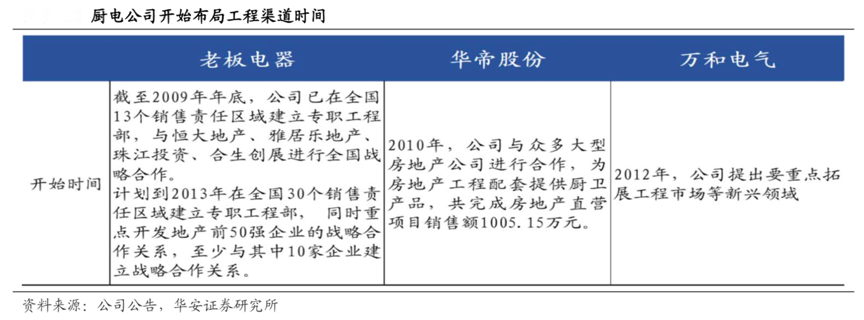 經(jīng)典案例:根據(jù)公司公告、華安證券研究所等綜合資訊表明,早在老板電器2010 年上市前,其已經(jīng)開(kāi)始布局工程渠道,根據(jù)招股說(shuō)明書(shū),截至 2009 年底,其已在 13 個(gè)銷售區(qū)域成立工程部,并與恒大地產(chǎn)、珠江投資等地產(chǎn)商建立合作關(guān)系,在工程渠道紅利來(lái)臨之前及時(shí)搶占“先發(fā)優(yōu)勢(shì)”。