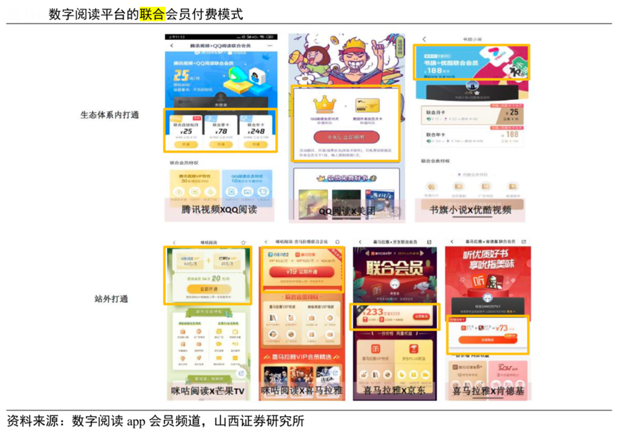 經(jīng)典案例:根據(jù)數(shù)字閱讀app會(huì)員頻道、山西證券研究所等綜合資訊表明,例如騰訊推出的“騰訊大王卡”,以騰訊體系內(nèi)超 100 款 app 專(zhuān)屬免流量的模式吸引用戶訂閱,進(jìn)行資源和用戶流量的整合。除互聯(lián)網(wǎng)平臺(tái)生態(tài)外,數(shù)字閱讀平臺(tái)也會(huì)與站外其他平臺(tái)進(jìn)行打通推出聯(lián)合會(huì)員的模式,如咪咕閱讀與喜馬拉雅、芒果 TV 以及 掌閱與優(yōu)酷視頻等,實(shí)現(xiàn)跨平臺(tái)的相互導(dǎo)流和提高用戶粘性,獲得增量付費(fèi)。