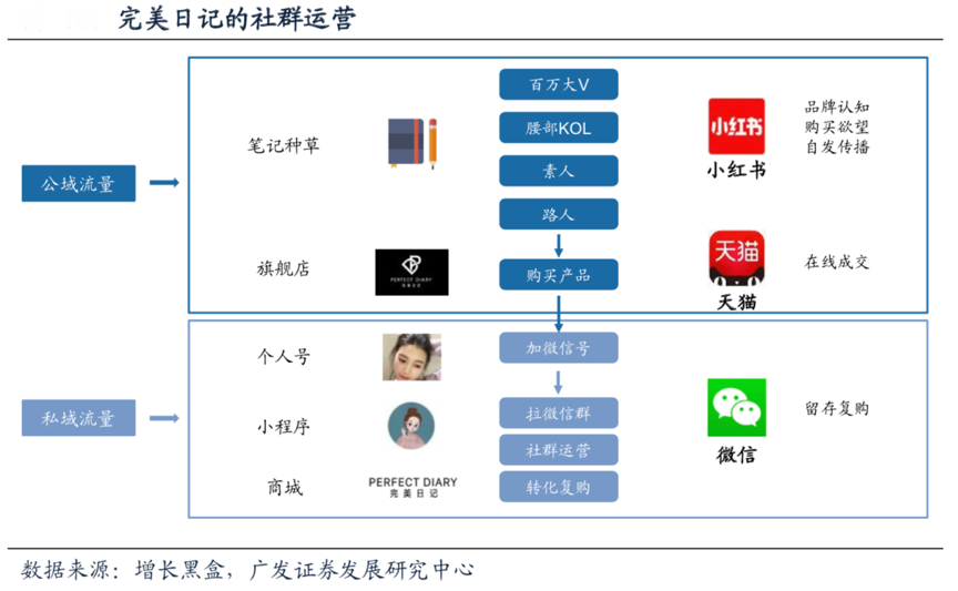 經(jīng)典案例:根據(jù)增長(zhǎng)黑盒和廣發(fā)證券發(fā)展研究中心等綜合資訊表明,2018年年底品牌在淘寶直播的轉(zhuǎn)化就超過(guò)了在小紅書(shū)的轉(zhuǎn)化。通過(guò)流量平臺(tái)以及流量明星代言的方式實(shí)現(xiàn)品牌曝光和種草之后,完美日記由獲取公域流量轉(zhuǎn)向私域流量的沉淀及運(yùn)營(yíng)。通過(guò)自建公眾號(hào)以及微信個(gè)人號(hào)將客群引流至微信,經(jīng)營(yíng)“小完子”IP,構(gòu)建品牌的微信好友流量池,實(shí)現(xiàn)品牌粉絲的沉淀、運(yùn)營(yíng)。