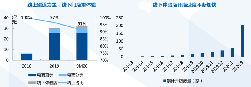 經(jīng)典案例:根據(jù)逸仙電商招股說(shuō)明書(shū)、增長(zhǎng)黑盒和國(guó)泰君安證券研究等綜合資訊表明,完美日記線上渠道主要包括天貓、京東、唯品會(huì)等電商平臺(tái)以及微信、抖音、快手、小紅書(shū)、嗶哩嗶哩等社交平臺(tái),線下門店致力于打造沉浸式的試妝體驗(yàn),增強(qiáng)與消費(fèi)者的互動(dòng)感。2020年前三季度,公司線上直銷收入達(dá)25.6億元、同比增長(zhǎng) 56%;線上平臺(tái)分銷收入達(dá)4.3億元、同比增長(zhǎng)104%;線下收入達(dá)2.8億元、同比增長(zhǎng)176%。截至9月底,其已在中國(guó)90多個(gè)城市開(kāi)設(shè)了200余家線下體驗(yàn)店,多位于高線級(jí)城市購(gòu)物商圈。