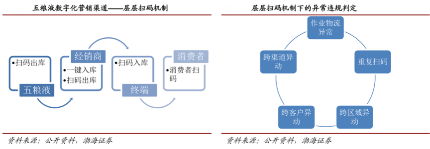 經(jīng)典案例:根據(jù)公開資料、渤海證券等綜合資訊表明,五糧液公司在數(shù)字化營銷模型基本搭建完成以及第八代經(jīng)典五糧液上市之后,其開始采用“控盤分利”營銷模式。首先基于層層掃碼機(jī)制,構(gòu)建穩(wěn)定且透明的渠道結(jié)構(gòu),實(shí)現(xiàn)對(duì)產(chǎn)品流通的透明高效的數(shù)字化跟蹤監(jiān)控以及衡量評(píng)估。
