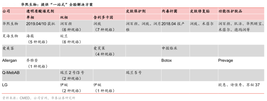 經典案例:根據(jù)CMED、公司官網、華泰證券研究所等綜合資訊表明,華熙新品頻出,其開發(fā)了不同層次和注射部位 的透明質酸填充產品,全面覆蓋低頻(填充劑:6-12 個月/次,肉毒:4-6 個月/次)、中頻 (醫(yī)用皮膚保護劑、皮膚修護貼,1-2 個月/次)、高頻(系列護膚品,1-2 次/天),針對醫(yī)美產品進行全方位覆蓋提升。