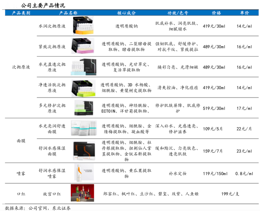 經(jīng)典案例:根據(jù)公司官網(wǎng)、東北證券等綜合資訊表明,華熙生物生產(chǎn)了一系列具有不同功效的無菌、無防腐劑小包裝次拋原液產(chǎn)品,該系列產(chǎn)品辨識(shí)度高且競品較少,同時(shí)其還先后開發(fā)出以添加透明質(zhì)酸及衍生物為核心的面膜、噴霧、水乳膏霜等功能性護(hù)膚品。