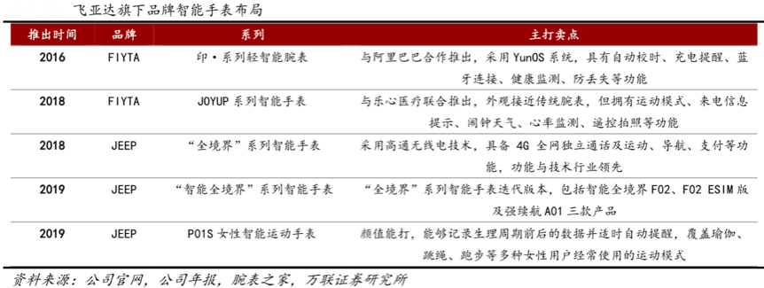 經(jīng)典要素:根據(jù)公司官網(wǎng)、公司年報(bào)、腕表之家、萬(wàn)聯(lián)證券研究所等綜合資訊表明,2016年起飛亞達(dá)通過“FIYTA”與“JEEP”品牌布局智能手表領(lǐng)域,是國(guó)內(nèi)傳統(tǒng)手表廠商領(lǐng)先者,2019年 ESIM版“智能全境界”智能手表新品為中國(guó)聯(lián)通官方首批認(rèn)證的智能手表,在智能手表通訊領(lǐng)域技術(shù)領(lǐng)先。