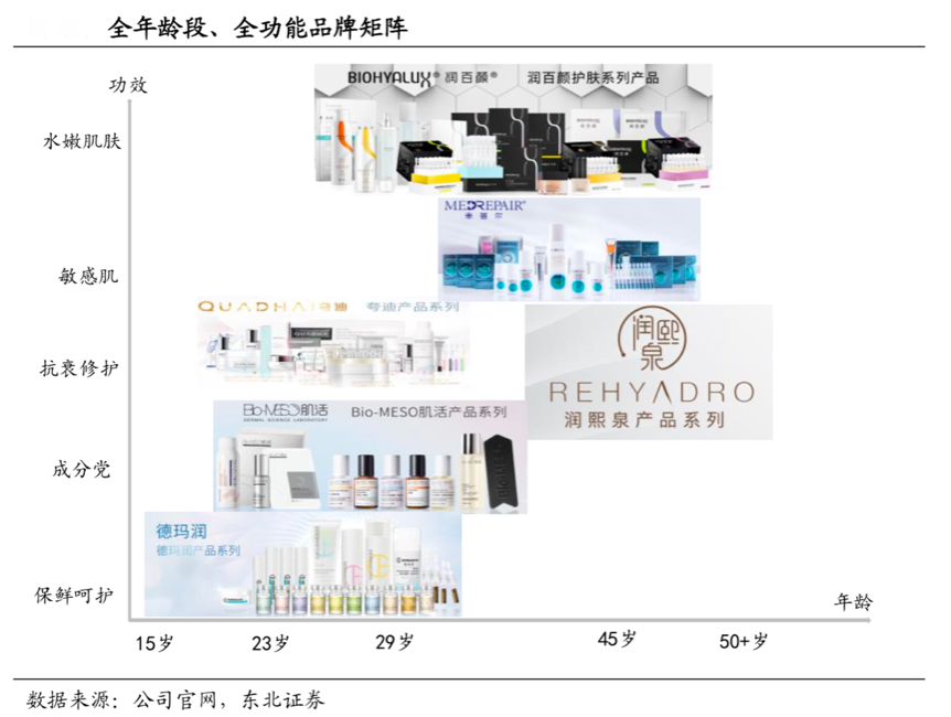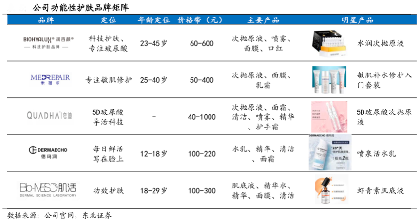 經(jīng)典案例:根據(jù)公司官網(wǎng)、東北證券等綜合資訊表明,華熙生物依托技術(shù)優(yōu)勢,打造多品牌進(jìn)駐功能性護(hù)膚領(lǐng)域。2018 年在原有“潤百顏”品牌基礎(chǔ)上,陸續(xù)推出“BIO-MESO”、“米蓓爾”、“夸迪”、“德瑪潤”、“華熙頤寶”等多個(gè)新品牌。新品牌以透明質(zhì)酸及其他生物活性物質(zhì)為核心成分,針對(duì)敏感皮膚、皮膚屏障受損等不同的皮膚問題定位精準(zhǔn)人群。功能性護(hù)膚品將成為公司未來業(yè)績?cè)鲩L的重要驅(qū)動(dòng)力。