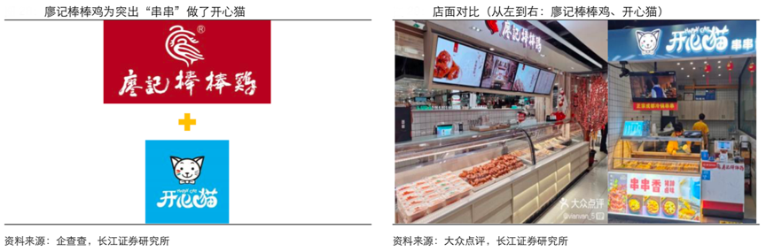 經(jīng)典案例:根據(jù)企查查、大眾點(diǎn)評(píng)、長(zhǎng)江證券研究所等綜合資訊表明,廖記棒棒雞創(chuàng)立于 1993 年,崛起于西南,全國(guó)開店超 600 家,經(jīng)營(yíng)鹵菜、拌菜、串串等。同時(shí)其于2018年又創(chuàng)辦新品牌“開心貓”串串香,縮減廖記本店的柜面,將原有的“三個(gè)區(qū)域”包裝食品、菜肴熟食、冷鍋串串縮減為以“冷鍋串串”為主,店鋪更小,精準(zhǔn)聚焦商場(chǎng)中“逛吃”的休閑需求。